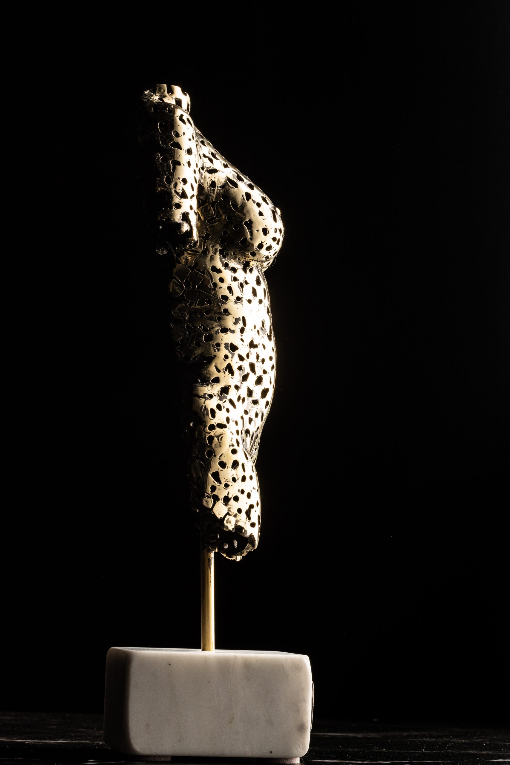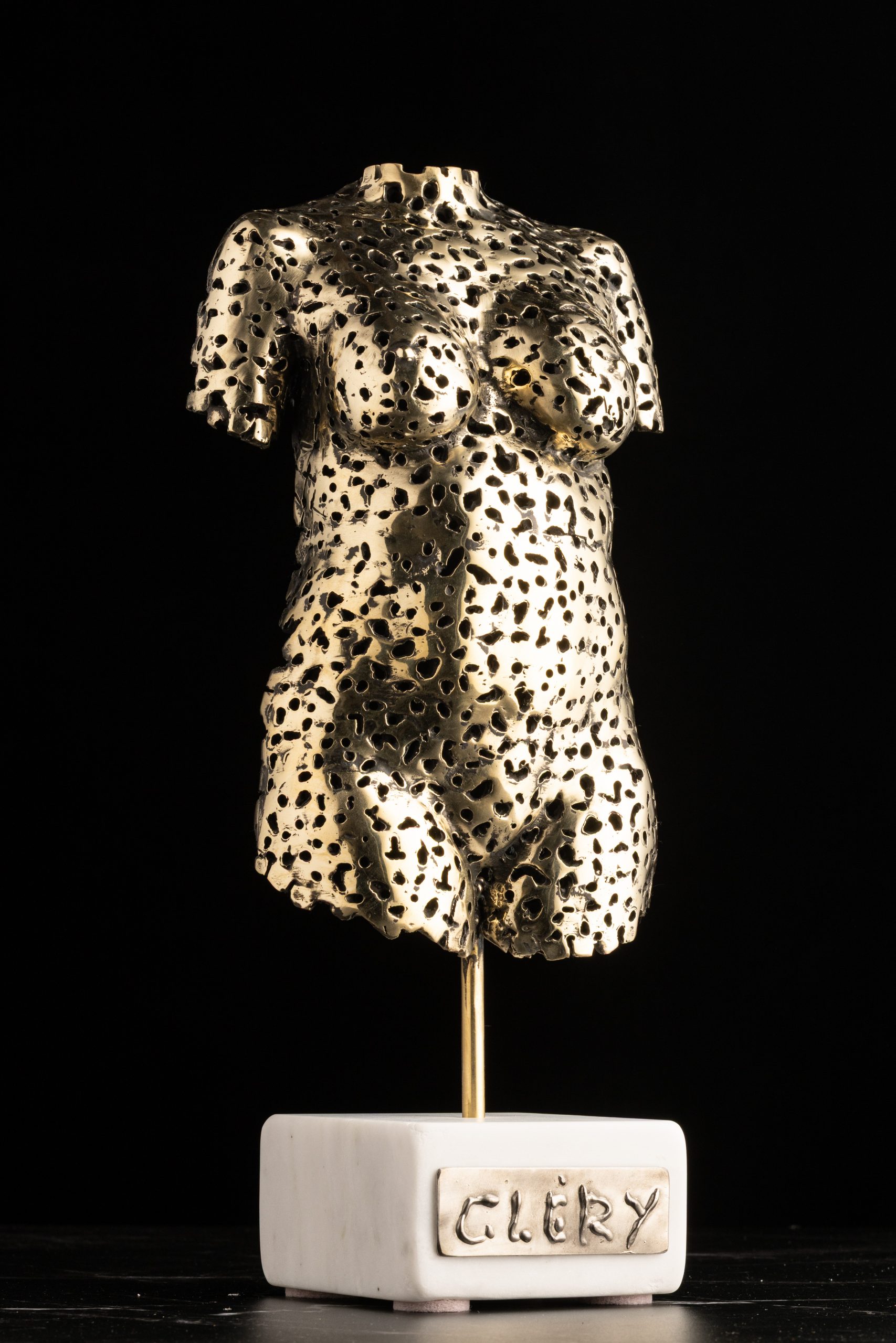 Matériaux : Sculpture en bronzedoré, support en marbre blanc de Carrare,