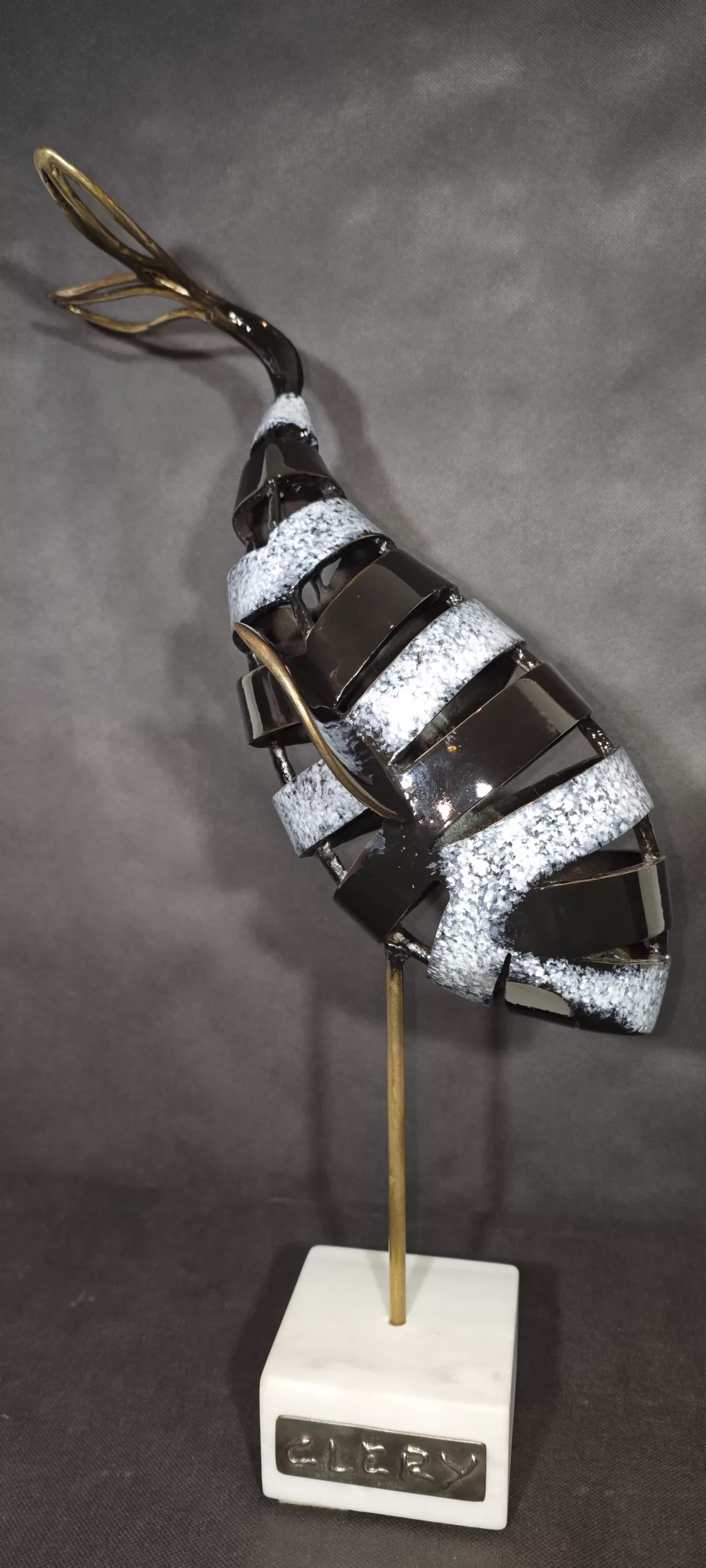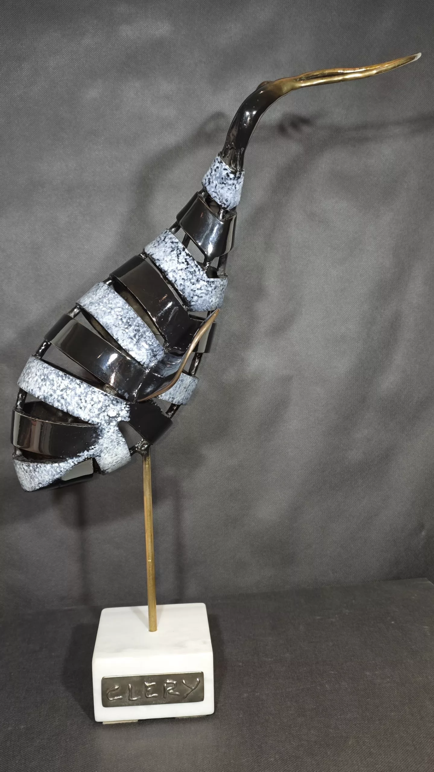 Matériaux : bronze patiné et polie Noir et Blanche sur support en marbre blanc de Carrare avec signature de l’artiste en Inox 316L.